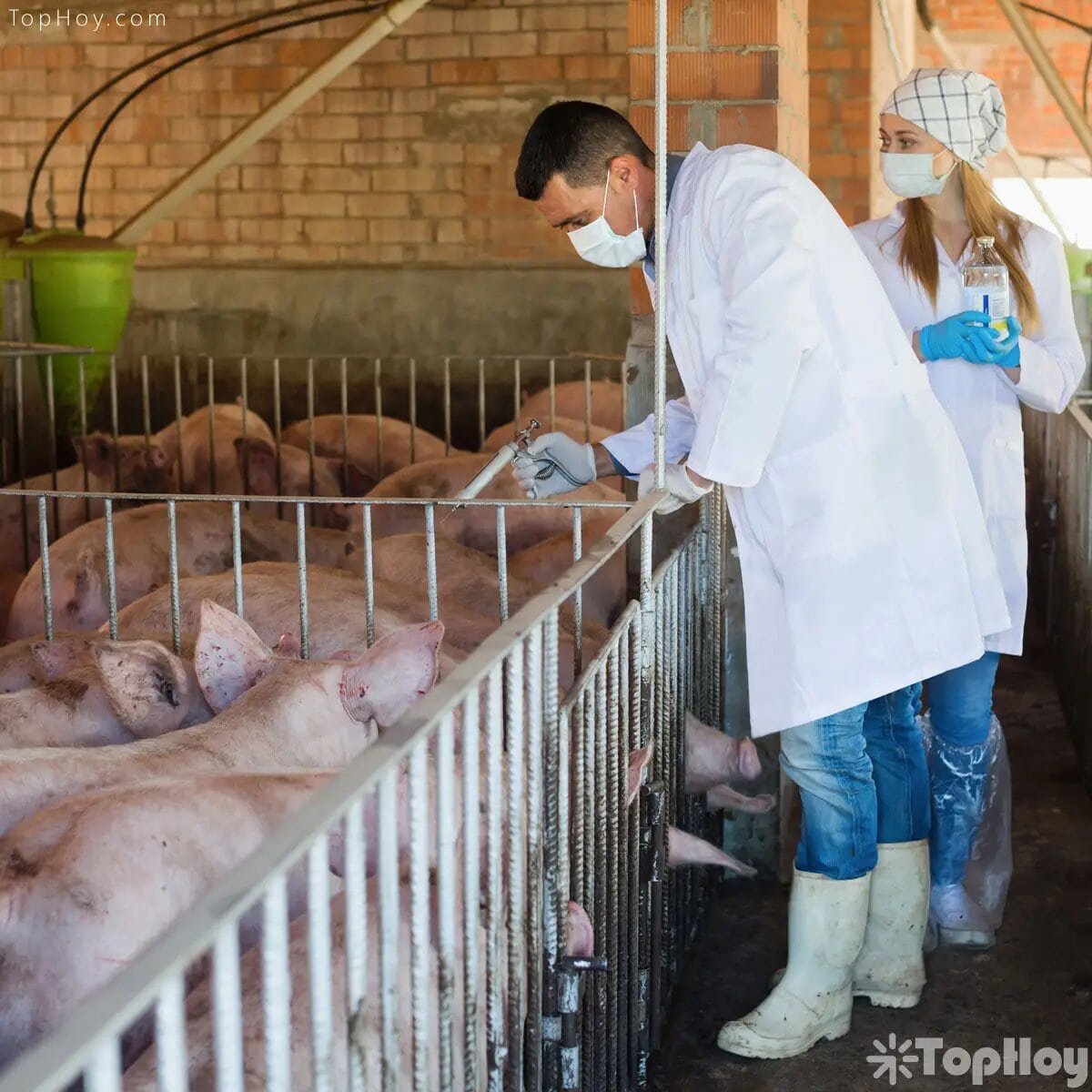 criadero de cerdos poniendo vacunas